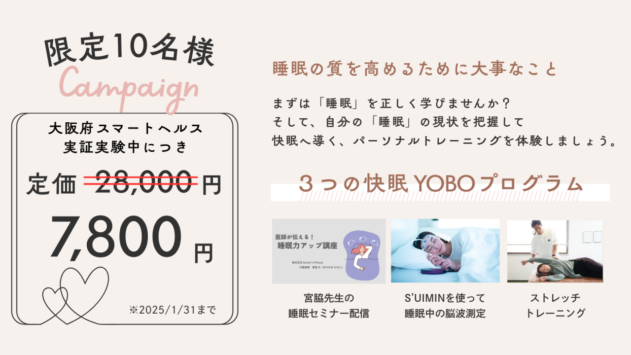 今回の快眠YOBOパックは、宮脇院長がアドバイザーを務める「大阪府スマートヘルスプロジェクト」の実証事業の一環となり、限定10名のみとさせていただきます。